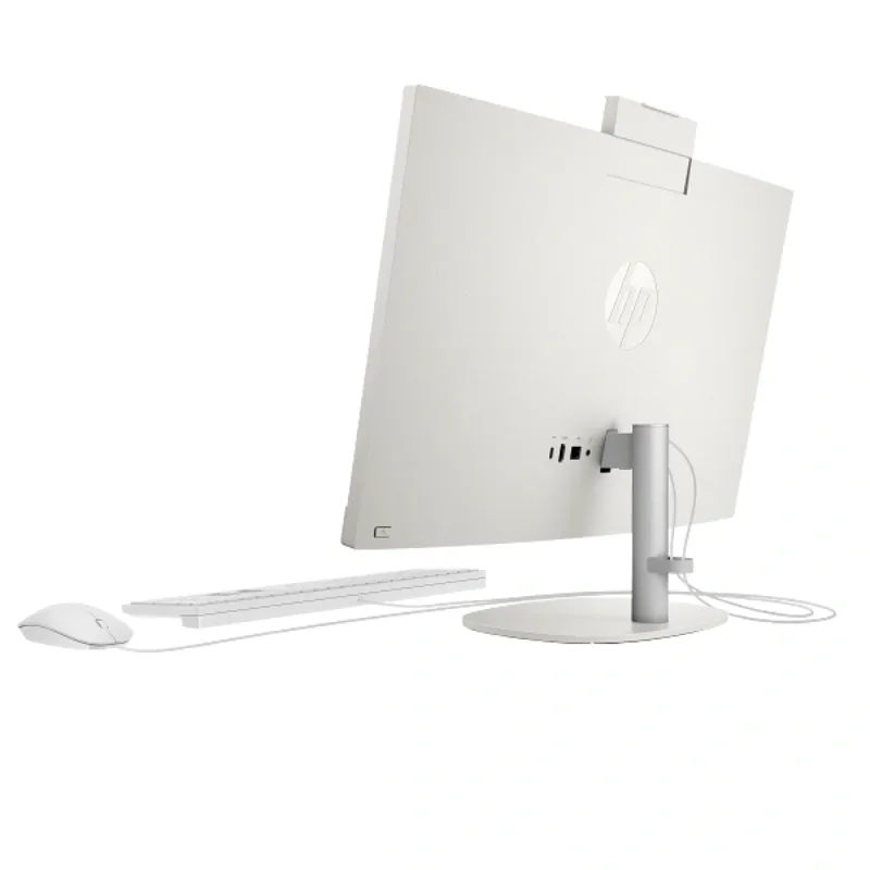 HP در طراحی این مدل از زبان بصری مینیمال و مدرن استفاده کرده است. بدنه سفید با خطوط ساده، پایه فلزی خمیده و نمایشگر بدون حاشیه در سه طرف، ظاهری تمیز و حرفه‌ای به دستگاه داده‌اند. طراحی یکپارچه باعث می‌شود میز کار شما همیشه مرتب باقی بماند و ظاهر دستگاه با دکورهای خانگی یا اداری کاملاً هماهنگ باشد.