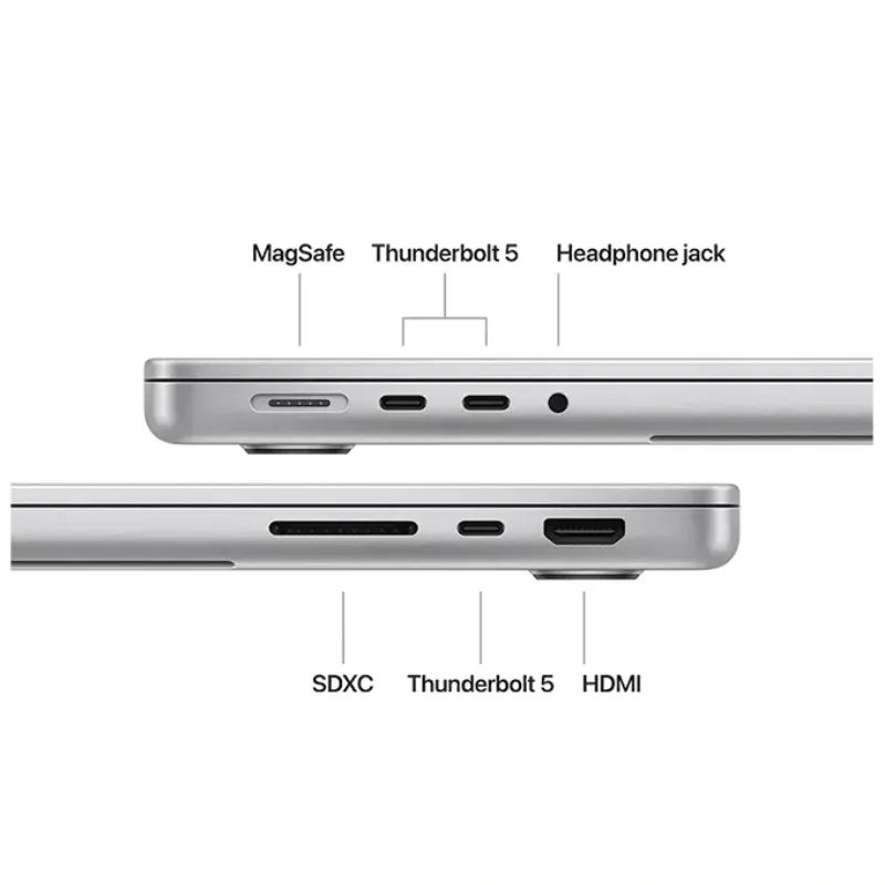 پیکربندی پورتها شامل چند درگاه Thunderbolt/USB‑C، HDMI و اسلات کارت SDXC است که برای انتقال فایل از دوربین و اتصال نمایشگرهای خارجی مناسب است. پشتیبانی از Wi‑Fi 6E و بلوتوث نسخههای جدید اتصال بیسیم پایدار و کمتاخیر را فراهم میکند.