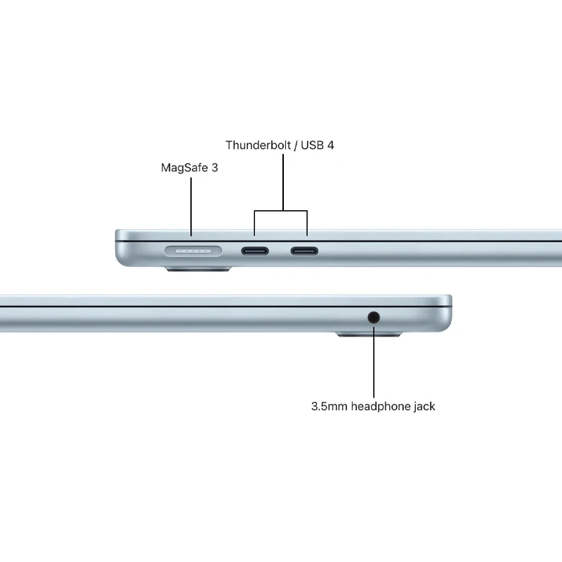 این مکبوک ایر مجهز به پورتهای USB-C است که استانداردهای مدرن اتصال را پشتیبانی میکنند. این پورتها امکان شارژ دستگاه، انتقال داده با سرعت بالا و اتصال به نمایشگرهای خارجی را فراهم میکنند. (در صورت داشتن اطلاعات دقیقتر در مورد نسخه Thunderbolt، میتوان جزئیات بیشتری اضافه کرد). پشتیبانی از آخرین استانداردهای وایفای و بلوتوث نیز اتصال بیسیم پایدار و سریعی را تضمین میکند.