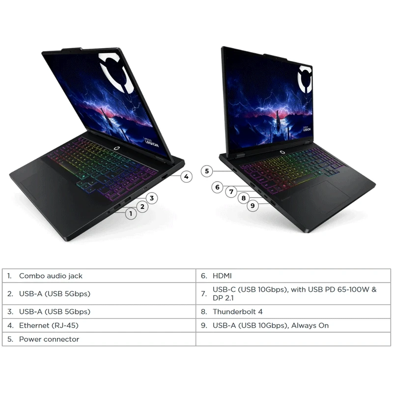 لنوو معمولاً در سری Legion پورتهای کاملی ارائه میدهد، از جمله: